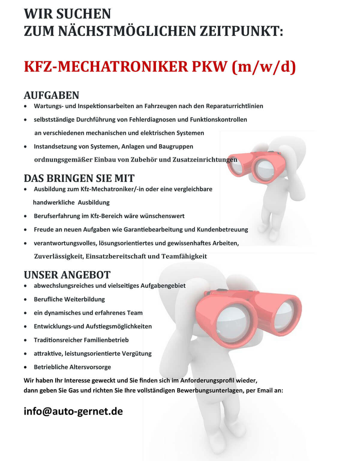 Wir haben Ihr Interesse geweckt und Sie finden sich im Anforderungsprofil wieder, dann geben Sie Gas und richten Sie Ihre vollständigen Bewerbungsunterlagen, per Email an: info@~@auto-gernet.de